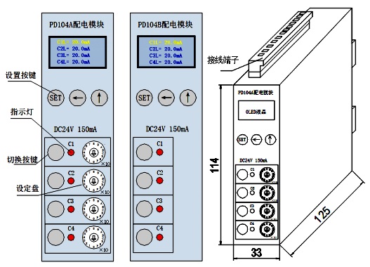 PD104系列直流配電控保模塊是DC24V直流配電系統(tǒng)控制保護(hù)模塊,以下簡稱模塊,該模塊具備1路輸入、4路輸出控制電源,同時(shí)OLED液晶實(shí)時(shí)顯示4路電流值。