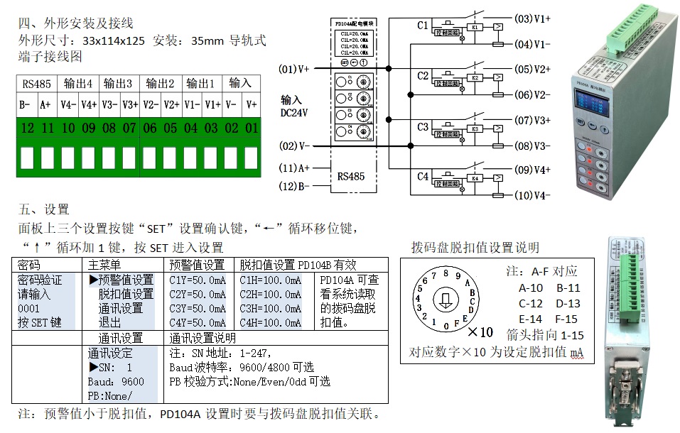 4,模塊通過面板上“SET”設(shè)置鍵、“←”循環(huán)移位鍵、“↑”循環(huán)加1鍵。在液晶屏上分別設(shè)置4路預(yù)警電流值,脫扣電流值(PD104B有效),當(dāng)某路電流超過預(yù)警值,該路指示燈閃爍。當(dāng)某路電流超過脫扣值(PD104B有效),該路指示燈滅,回路被自動(dòng)斷開,重新接通該回路需手動(dòng)按投入鍵。