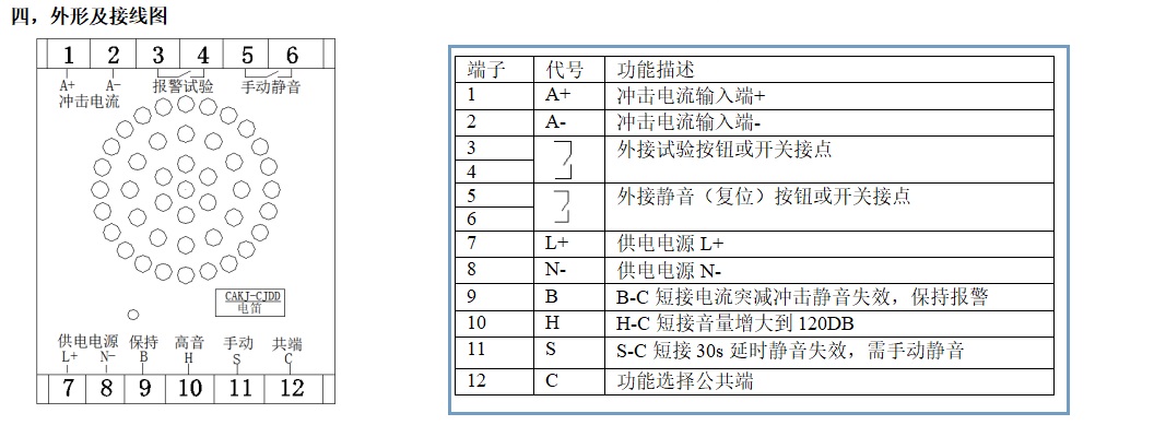注:電笛基本功能:某個光字牌報警時通過報警母線將電流輸入電笛,電笛檢測到突變的沖擊電流,則發(fā)出報警聲。若報警未返回,則延時30s自動靜音。若在30s內(nèi)報警信號消失,就形成電流突減狀態(tài),電笛同樣自動靜音。若選擇將B-C短接,則電流突減靜音功能失效,瞬時信號消失后保持報警。若同時將S-C短接,則30s自動靜音功能失效,在有信號報警時一直保持鳴響,需按外接手動靜音按鈕靜音。若一個信號報警后未返回,且已靜音,其他信號再次報警時將重復(fù)上述報警過程,電笛最多能承受2.5A的熱穩(wěn)定電流。電鈴與以上描述相同。