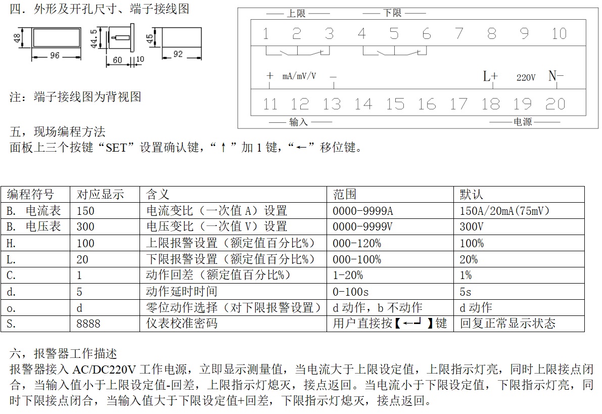報(bào)警輸出:過流和低電流值可設(shè)置,兩路繼電器接點(diǎn)輸出