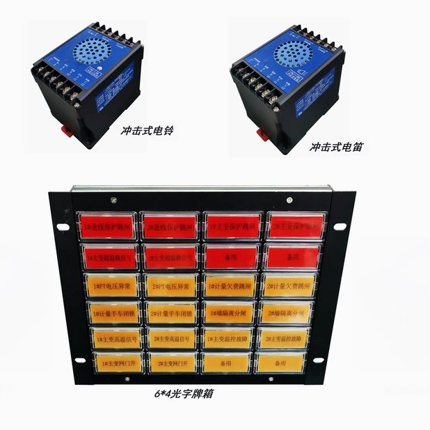 CAKJ-XHB-16YXT-32DIT分組信號報警系統(tǒng),該系統(tǒng)16個光字牌信號報警裝置,可帶多個32路信號采集模塊,每個光字牌對應信號開入可以進行分組編程。如1GP對應1-10個開入量,10個開入量不論哪個報警,光字牌1GP都閃光報警,信號確認后光字牌常亮,10個信號中另外1個信號報警,光字牌重新啟動閃光報警,依次類推。