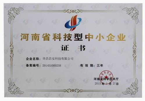 2015年1月21日,許昌昌安科技有限公司被河南省科學技術廳認定為“河南省科技型中小企業(yè)”,并頒發(fā)證書。